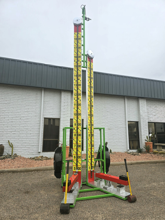 A dramatic, eye‑catching carnival attraction with one 17‑foot tower and one 14‑foot tower. Built for crowd participation, it’s designed so two players can compete at once: each strikes a padded mallet against the spring‑loaded base, sending a sliding weight up a tall, clearly numbered scale to ring the bell at the top.